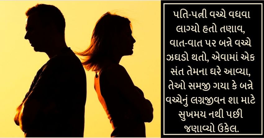 પતિની સાથે જો કોઈ બહારની સમસ્યા છે તો પત્ની સાથે તેની ચર્ચા-વિચારણાં કરવી જોઈએ પરંતુ બહારનો તણાવ ઘરમાં ન લાવવો જોઈએ. બંનેને સંતની વાત સમજ આવી ગઈ. તેના પછી તેમના જીવનમાં બધી વાતો સ્પષ્ટ થઈ ગઈ અને તે એકબીજાની પરેશાનીઓનો ઉકેલ કરવા લાગ્યા. ધીમે-ધીમે તેમનું જીવન ખુશીઓથી ભરાઇ ગયું.