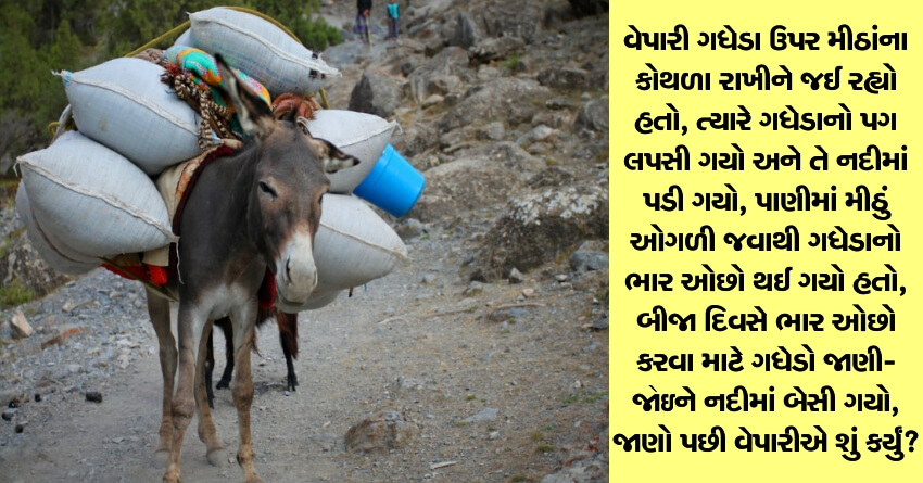 વેપારી ગધેડા ઉપર મીઠાંના કોથળા રાખીને જઈ રહ્યો હતો, ત્યારે ગધેડાનો પગ લપસી ગયો અને તે નદીમાં પડી ગયો, પાણીમાં મીઠું ઓગળી જવાથી ગધેડાનો ભાર ઓછો થઈ ગયો હતો, બીજા દિવસે ભાર ઓછો કરવા માટે ગધેડો જાણી-જોઇને નદીમાં બેસી ગયો, જાણો પછી વેપારીએ શું કર્યું?