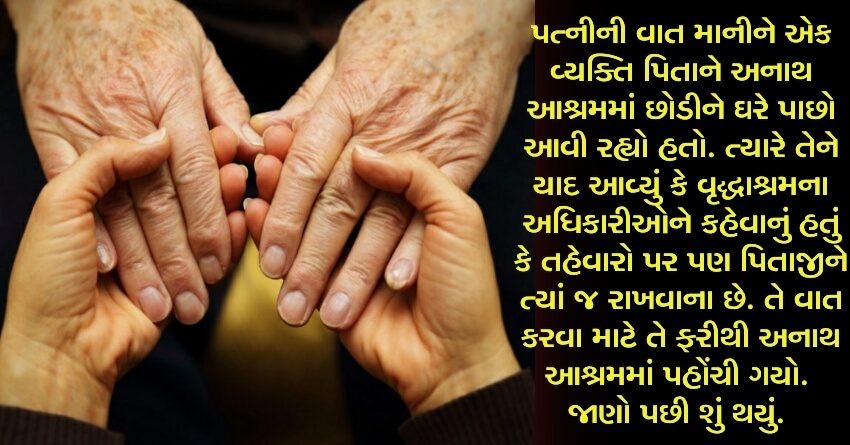 પત્નીની વાત માનીને એક વ્યક્તિ પિતાને અનાથ આશ્રમમાં છોડીને ઘરે પાછો આવી રહ્યો હતો. ત્યારે તેને યાદ આવ્યું કે વૃદ્ધાશ્રમના અધિકારીઓને કહેવાનું હતું કે તહેવારો પર પણ પિતાજીને ત્યાં જ રાખવાના છે. તે વાત કરવા માટે તે ફરીથી અનાથ આશ્રમમાં પહોંચી ગયો. જાણો પછી શું થયું.