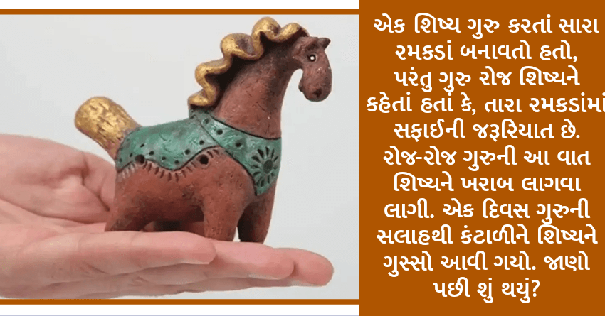 એક શિષ્ય ગુરુ કરતાં સારા રમકડાં બનાવતો હતો, પરંતુ ગુરુ રોજ શિષ્યને કહેતાં હતાં કે, તારા રમકડાંમાં સફાઈની જરૂરિયાત છે. રોજ-રોજ ગુરુની આ વાત શિષ્યને ખરાબ લાગવા લાગી. એક દિવસ ગુરુની સલાહથી કંટાળીને શિષ્યને ગુસ્સો આવી ગયો. જાણો પછી શું થયું?
