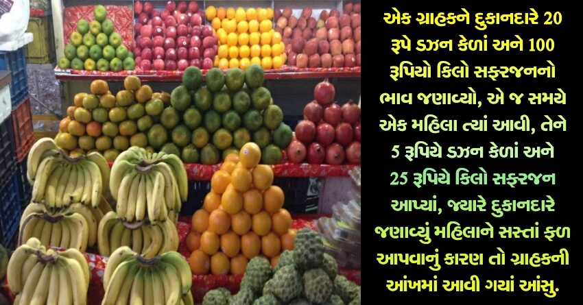 એક ગ્રાહકને દુકાનદારે 20 રૂપે ડઝન કેળાં અને 100 રૂપિયો કિલો સફરજનનો ભાવ જણાવ્યો, એ જ સમયે એક મહિલા ત્યાં આવી, તેને 5 રૂપિયે ડઝન કેળાં અને 25 રૂપિયે કિલો સફરજન આપ્યાં, જ્યારે દુકાનદારે જણાવ્યું મહિલાને સસ્તાં ફળ આપવાનું કારણ તો ગ્રાહકની આંખમાં આવી ગયાં આંસુ.