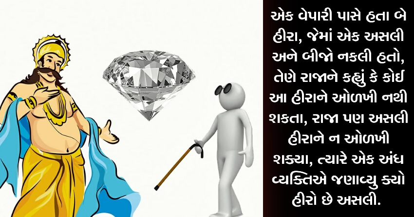 એક વેપારી પાસે હતા બે હીરા, જેમાં એક અસલી અને બીજો નકલી હતો, તેણે રાજાને કહ્યું કે કોઈ આ હીરાને ઓળખી નથી શકતા, રાજા પણ અસલી હીરાને ન ઓળખી શક્યા, ત્યારે એક અંધ વ્યક્તિએ જણાવ્યુ ક્યો હીરો છે અસલી.