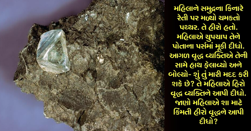 મહિલાને સમુદ્રના કિનારે રેતી પર મળ્યો ચમકતો પથ્થર. તે હીરો હતો. મહિલાએ ચુપચાપ તેને પોતાના પર્સમાં મૂકી દીધો. આગળ વૃદ્ધ વ્યક્તિએ તેની સામે હાથ ફેલાવ્યો અને બોલ્યો- શું તું મારી મદદ કરી શકે છે? તે મહિલાએ હિરો વૃદ્ધ વ્યક્તિને આપી દીધો. જાણો મહિલાએ શા માટે કિંમતી હીરો વૃદ્ધને આપી દીધો?