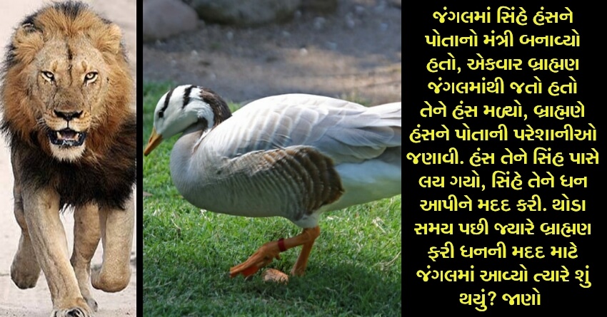 જંગલમાં સિંહે હંસને પોતાનો મંત્રી બનાવ્યો હતો, એકવાર બ્રાહ્મણ જંગલમાંથી જતો હતો તેને હંસ મળ્યો, બ્રાહ્મણે હંસને પોતાની પરેશાનીઓ જણાવી. હંસ તેને સિંહ પાસે લય ગયો, સિંહે તેને ધન આપીને મદદ કરી. થોડા સમય પછી જ્યારે બ્રાહ્મણ ફરી ધનની મદદ માટે જંગલમાં આવ્યો ત્યારે શું થયું? જાણો