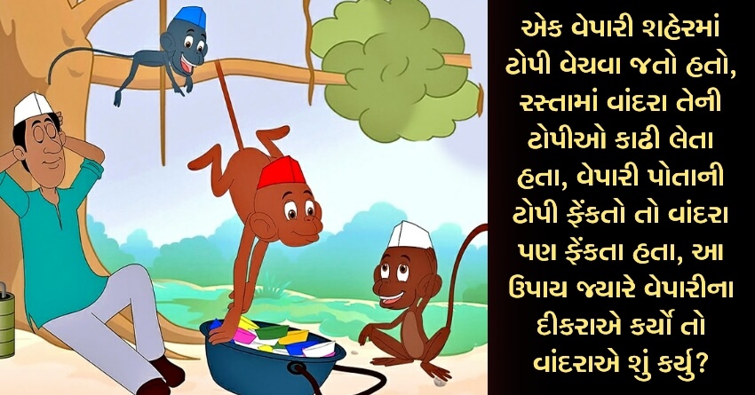 એક વેપારી શહેરમાં ટોપી વેચવા જતો હતો, રસ્તામાં વાંદરા તેની ટોપીઓ કાઢી લેતા હતા, વેપારી પોતાની ટોપી ફેંકતો તો વાંદરા પણ ફેંકતા હતા, આ ઉપાય જ્યારે વેપારીના દીકરાએ કર્યો તો વાંદરાએ શું કર્યુ?