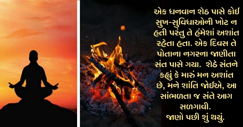 એક નગરમાં ધનવાન શેઠ પાસે કોઈ સુખ-સુવિધાઓની ખોટ ન હતી પરંતુ તે હંમેશાં અશાંત રહેતા હતા. એક દિવસ તે પોતાના નગરના જાણીતા સંત પાસે ગયા. શેઠે સંતને કહ્યું કે મારું મન અશાંત છે, મને શાંતિ જોઈએ, આ સાંભળતા જ સંતે આગ સળગાવી. જાણો પછી શું થયું.