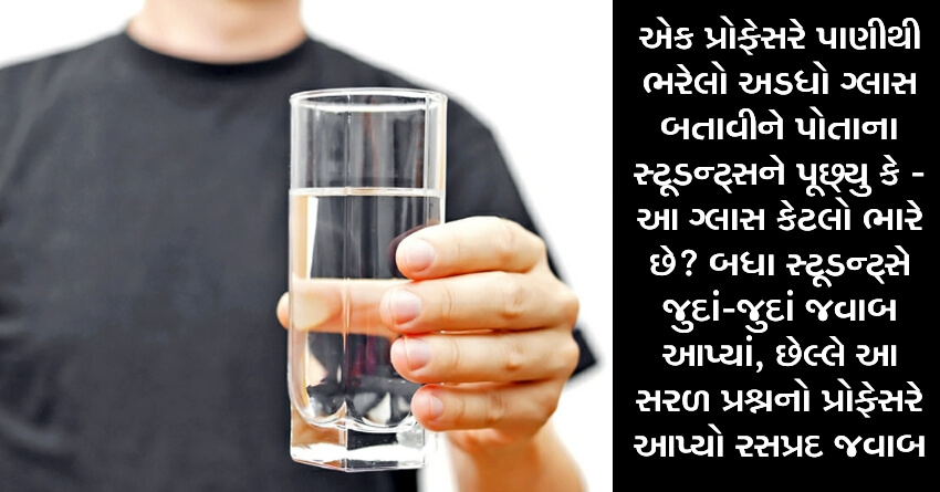 એક પ્રોફેસરે પાણીથી ભરેલો અડધો ગ્લાસ બતાવીને પોતાના સ્ટૂડન્ટ્સને પૂછ્યુ કે – આ ગ્લાસ કેટલો ભારે છે? બધા સ્ટૂડન્ટ્સે જુદાં-જુદાં જવાબ આપ્યાં, છેલ્લે આ સરળ પ્રશ્નનો પ્રોફેસરે આપ્યો રસપ્રદ જવાબ