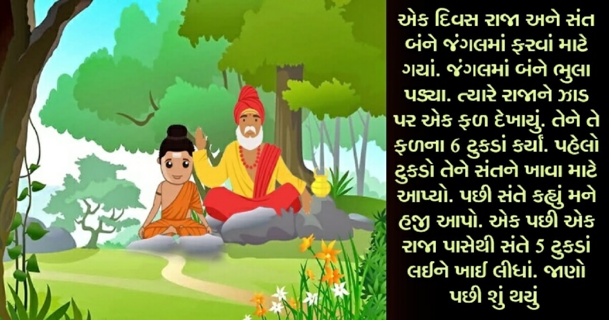 એક દિવસ રાજા અને સંત બંને જંગલમાં ફરવાં માટે ગયાં. જંગલમાં બંને ભુલા પડ્યા. ત્યારે રાજાને ઝાડ પર એક ફળ દેખાયું. તેને તે ફળના 6 ટુકડાં કર્યાં. પહેલો ટુકડો તેને સંતને ખાવા માટે આપ્યો. પછી સંતે કહ્યું મને હજી આપો. એક પછી એક રાજા પાસેથી સંતે 5 ટુકડાં લઈને ખાઈ લીધાં. જાણો પછી શું થયું