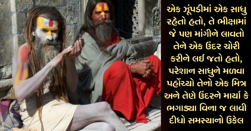 એક ઝૂંપડીમાં એક સાધુ રહેતો હતો, તે ભીક્ષામાં જે પણ માંગીને લાવતો તેને એક ઉંદર ચોરી કરીને લઈ જતો હતો, પરેશાન સાધુને મળવા પહોંચ્યો તેનો એક મિત્ર અને તેણે ઉંદરને માર્યા કે ભગાડ્યા વિના જ લાવી દીધો સમસ્યાનો ઉકેલ