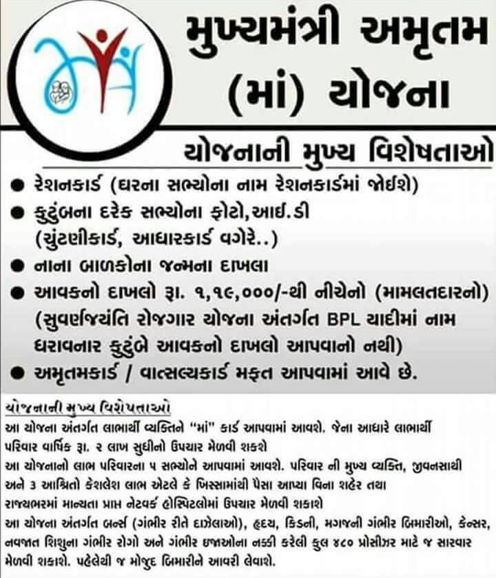 • “મા” કાર્ડ ધરાવતો લાભાર્થી યોજના સાથે જોડાયેલ સારી સુવિધા ધરાવતી હોસ્પિટલો માં જઇ ને લાભ લઇ શકે છે.