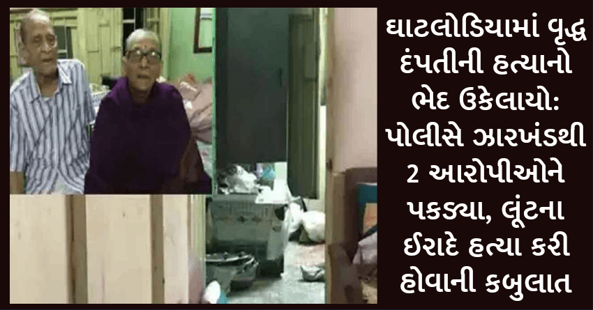 દિવાળીની આગલી સાંજે જ ઘાટલોડિયાના પારસમણિ એપાર્ટમેન્ટમાં રહેતા વૃદ્ધ દંપતિની કરપીણ હત્યા કેસનો ભેદ ઉકેલાઇ ગયો છે. પોલીસે ઝારખંડથી બે આરોપીઓને ઝડપી પાડ્યા છે અને બંનેએ કબૂલ્યું છે કે લૂંટના ઇરાદે આ હત્યા કરી હતી. આરોપીઓનું કહેવું છે કે અમને કોઇ જોઇ જશે એવો ડર લાગ્યો એટલે અમે ત્યાંથી ભાગી ગયા હતા.
