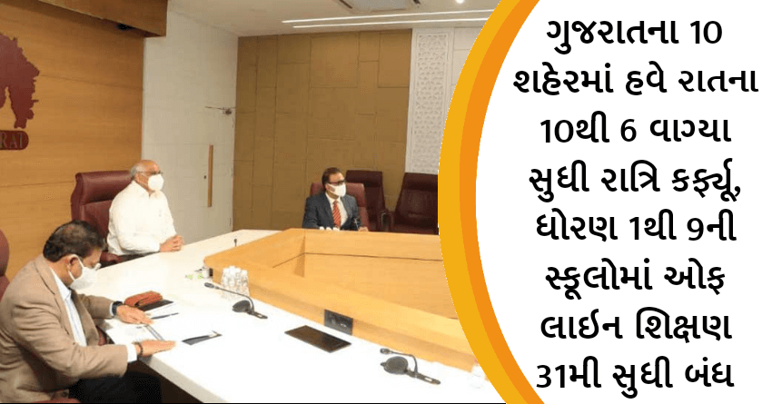 ગુજરાતના 10 શહેરમાં હવે રાતના 10થી 6 વાગ્યા સુધી રાત્રિ કર્ફ્યૂ, ધોરણ 1થી 9ની સ્કૂલોમાં ઓફ લાઇન શિક્ષણ 31મી સુધી બંધ