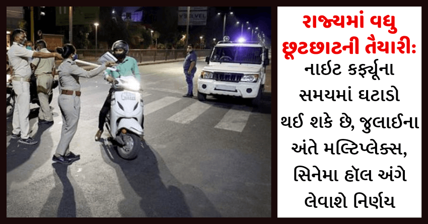 રાજ્યમાં વધુ છૂટછાટની તૈયારી: નાઇટ કર્ફ્યૂના સમયમાં ઘટાડો થઈ શકે છે, જુલાઈના અંતે મલ્ટિપ્લેક્સ, સિનેમા હૉલ અંગે લેવાશે નિર્ણય