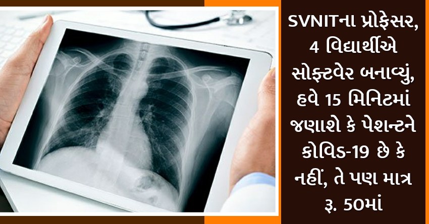 પેશન્ટને કોવિડ-19 છે કે નહીં? તેનો રિપોર્ટ 15 કલાકની જગ્યાએ હવે 15 જ મિનિટમાં જાણી શકાશે. એટલું જ નહીં, રિપોર્ટ કાઢવા પાછળ માત્ર રૂ. 50નો જ ખર્ચ થનારો છે. SVNITના એશાઇન (ASHINE) ઇન્ક્યુબેશન સેન્ટરના વડા પ્રો. ડો જ્યોતિર્મય બેનર્જીઅને ચાર વિદ્યાર્થી નિખિલ વ્યાસ, પ્રત્યુષ ગુપ્તા, દિવ્યા શાહ, કિશન સિંગ અને હેત શાહે મળી આર્ટિફિશ્યલ ઇન્ટેલિજન્સ એન્ડ ડીપ લર્નિંગથી સોફ્ટવેર બનાવ્યું છે. ડોક્ટરોએ સોફ્ટવેરમાં સ્પેક્ટેડ પેશન્ટની ચેસ્ટનો એક્સ-રે પાડીને સોફ્ટ કોપી નખાતા કોવિડ-19 છે કે નહીં? તે જાણી શકશે.