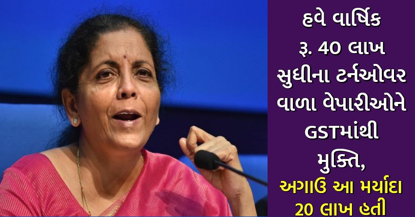 હવે વાર્ષિક રૂ. 40 લાખ સુધીના ટર્નઓવર વાળા વેપારીઓને GSTમાંથી મુક્તિ, અગાઉ આ મર્યાદા 20 લાખ હતી