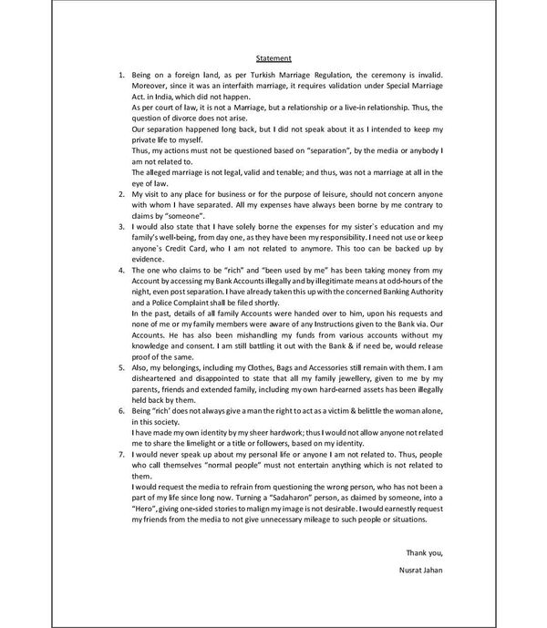નુસરતે તેના સ્ટેટમેન્ટમાં વધુમાં કહ્યું હતું કે અમે ઘણા સમય પહેલેથી જ છૂટાં પડી ગયાં હતાં, પરંતુ મેં કદી આ વિશે વાત એટલે નહોતી કરી, કારણ કે હું મારા જીવનને પ્રાઈવેટ રાખવા માગતી હતી, તેથી મારી કોઈપણ વાતને અમે છૂટા પડ્યા છીએ એ વાત સાથે જોડીને મને જજ ના કરો. જે લગ્નની વાત અત્યારે થઈ રહી છે એ માન્ય નથી અને કાયદાની દૃષ્ટિએ એ માન્ય નથી.