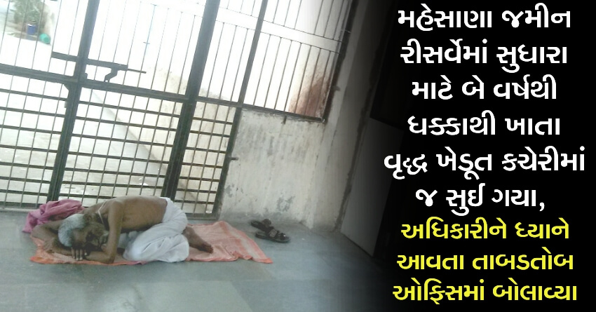 મહેસાણા જમીન રીસર્વેમાં સુધારા માટે બે વર્ષથી ધક્કાથી ખાતા વૃદ્ધ ખેડૂત કચેરીમાં જ સુઈ ગયા, અધિકારીને ધ્યાને આવતા તાબડતોબ ઓફિસમાં બોલાવ્યા
