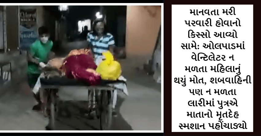 સુરત શહેર સાથે જિલ્લામાં પણ કોરોનાએ હાહાકાર મચાવ્યો છે. ત્યારે આ મહામારી વચ્ચે માનવતા મરી પરવારી હોવાનો ઘણા કિસ્સા સામે આવ્યા છે. દરમિયાન ઓલપાડનો એક કિસ્સો સામે આવ્યો છે. માતાને શ્વાસની તકલીફ થતા પુત્ર આખા શહેરમાં ફર્યો પણ વેન્ટિલેટર ન મળતા મોત થયું હતું. જ્યારે ગ્રામ પંચાયતમાંથી પુત્રને શબવાહિની ન આપવામાં આવતા લારીમાં માતાનો મૃતદેહ લઈ જવાની નોબત આવી હતી.