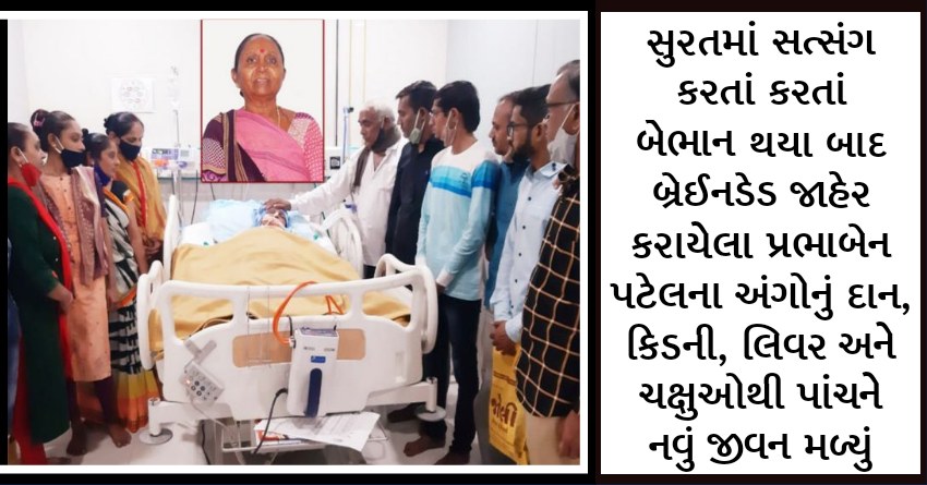 સુરતમાં સત્સંગ કરતાં કરતાં બેભાન થયા બાદ બ્રેઈનડેડ જાહેર કરાયેલા પ્રભાબેન પટેલના અંગોનું દાન : કિડની, લિવર અને ચક્ષુઓથી પાંચને નવું જીવન મળ્યું
