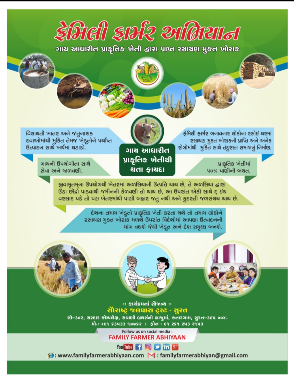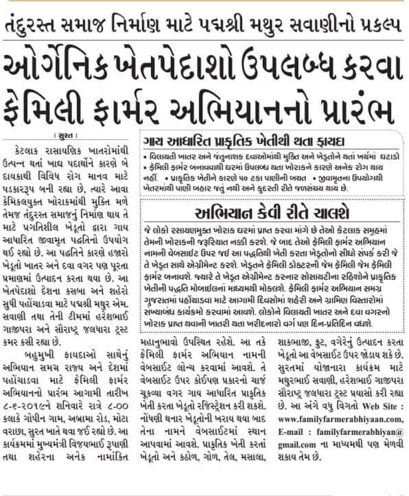કારણકે તેમનાં દ્વારા જે ફેમિલી ફાર્મર અભિયાનનું આયોજન કરવામાં આવ્યું છે. તેનાથી છેવાડાનાં માનવીને પણ ઓર્ગેનિક ફુડનો લાભ મળી રહેશે. ફેમિલી ફાર્મર અભિયાનને ગુજરાત રાજયનાં મુખ્યમંત્રી વિજયભાઈ રૂપાણી દ્વારા લીલીઝંડી આપવામાં આવી હતી તથા ૨૫ રાજયોનાં પ્રતિનિધિઓ પણ આ અભિયાનમાં જોડાયા હતા અને ઓર્ગેનિક ખાદ્ય સામગ્રીનાં વપરાશ માટે તેઓએ એક સ્વર કાઢયો હતો.