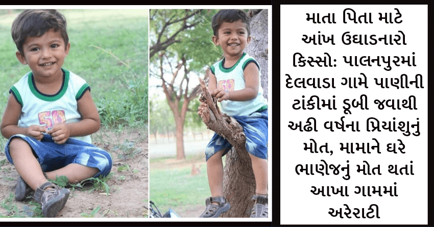 માતા પિતા માટે આંખ ઉઘાડનારો કિસ્સો: પાલનપુરમાં દેલવાડા ગામે પાણીની ટાંકીમાં ડૂબી જવાથી અઢી વર્ષના પ્રિયાંશુનું મોત, મામાને ઘરે ભાણેજનું મોત થતાં આખા ગામમાં અરેરાટી