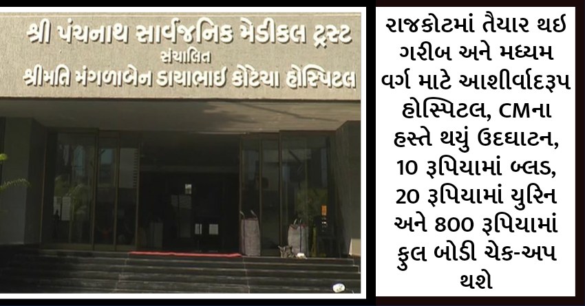 કોઈપણ મધ્યમ વર્ગની વ્યક્તિને બીમારી લાગુ પડે ત્યારે સૌથી મોટી ચિંતા હોસ્પિટલના બિલની હોય છે. ત્યારે રાજકોટમાં એક એવી હોસ્પિટલ તૈયાર થઇ છે જે ગરીબ અને મધ્યમ વર્ગ માટે આશીર્વાદરૂપ છે. રાજકોટમાં 146 વર્ષ જૂના પંચનાથ મંદિરમાં રાહત દરે હોસ્પિટલનું ઉદઘાટન CM રૂપાણીના હસ્તે કરવામાં આવ્યું હતું. હોસ્પિટલમાં ટોકન દરે લેબોરેટરીથી લઇને અતિ આધુનિક સર્જરી થશે. અહીં 10 રૂપિયામાં બ્લડ, 20 રૂપિયામાં યુરિન ટેસ્ટથી લઈને 800 રૂપિયામાં ફુલ બોડી ચેક-એપ કરી આપવામાં આવશે.