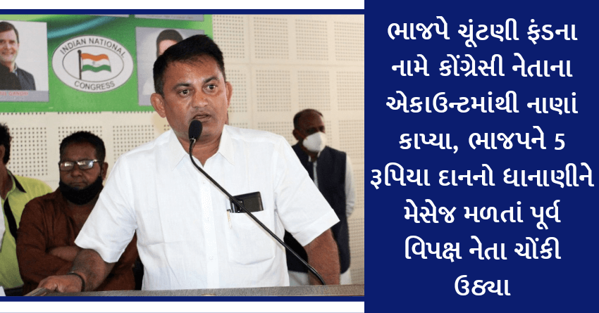 ભાજપે ચૂંટણી ફંડના નામે કોંગ્રેસી નેતાના એકાઉન્ટમાંથી નાણાં કાપ્યા, ભાજપને 5 રૂપિયા દાનનો ધાનાણીને મેસેજ મળતાં પૂર્વ વિપક્ષ નેતા ચોંકી ઉઠ્યા