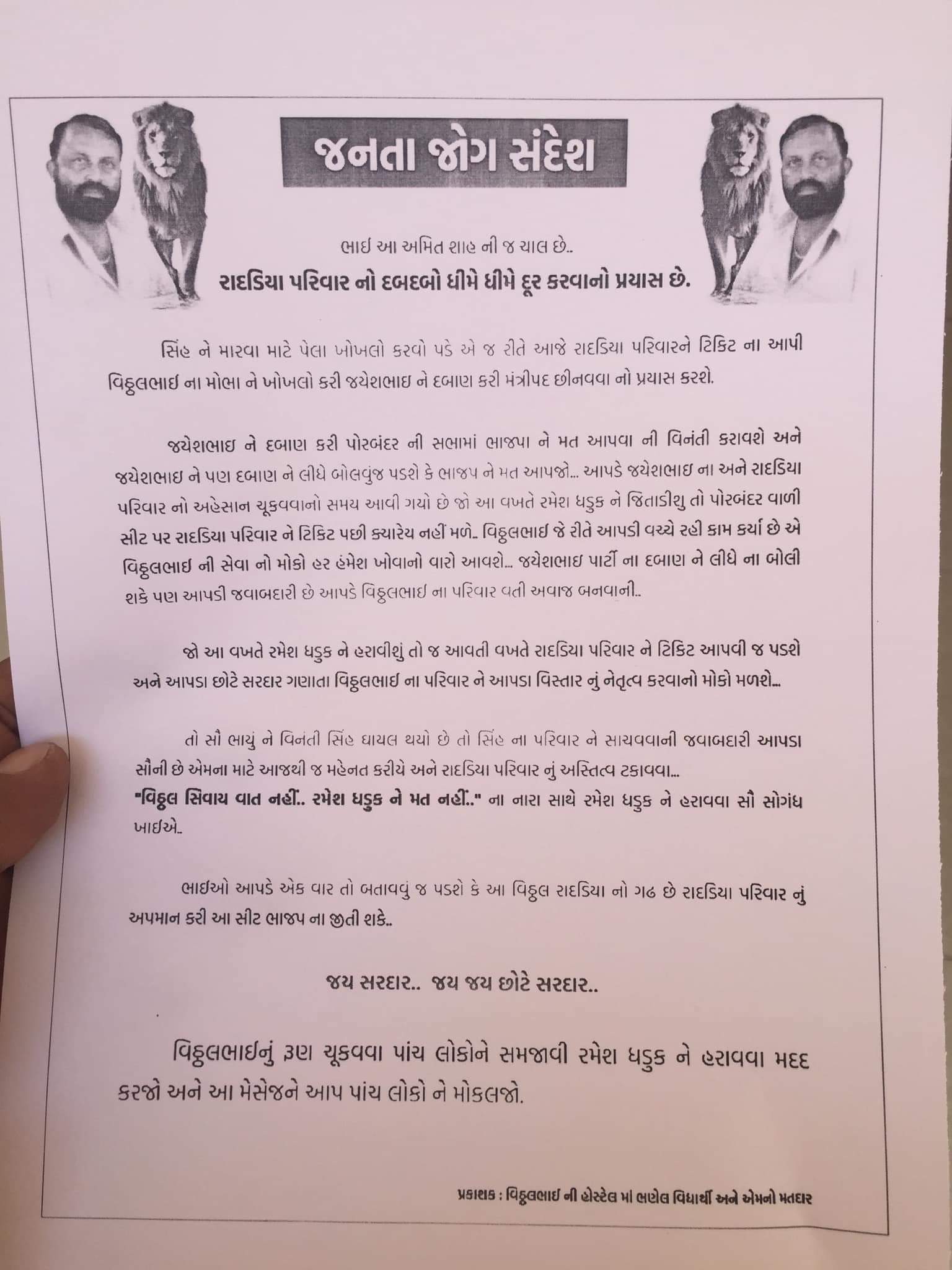વિઠ્ઠલ રાદડિયાની હોસ્ટેલમાં ભણેલા એક વિદ્યાર્થી (નામ લખ્યું નથી)એ પત્રિકા સોશિયલ મીડિયામાં વાઇરલ કરી છે. તેમાં જણાવ્યું છે કે, જયેશભાઇને દબાણ કરી પોરબંદરની સભામાં ભાજપને મત આપવાની વિનંતી કરાવશે અને જયેશભાઇને પણ દબાણને લીધે બોલવું જ પડશે કે ભાજપને મત આપજો. આપણે જયેશભાઇના અને રાદડિયા પરિવારનો અહેસાન ચૂકવવાનો સમય આવી ગયો છે. જો આ વખતે રમેશ ધડુકને જીતાડીશું તો પોરબંદરવાળી સીટ પર રાદડિયા પરિવારને ટિકિટ પછી ક્યારેય નહીં મળે. વિઠ્ઠલભાઇ જે રીતે આપણી વચ્ચે રહી કામ કર્યા છે એ વિઠ્ઠલભાઇની સેવાનો મોકો હર હંમેશ ખોવાનો વારો આવશે. જયેશભાઇ પાર્ટીના દબાણને લીધે ના બોલી શકે પણ આપણી જવાબદારી છે. આપણે વિઠ્ઠલભાઇના પરિવાર વતી અવાજ બનીએ.