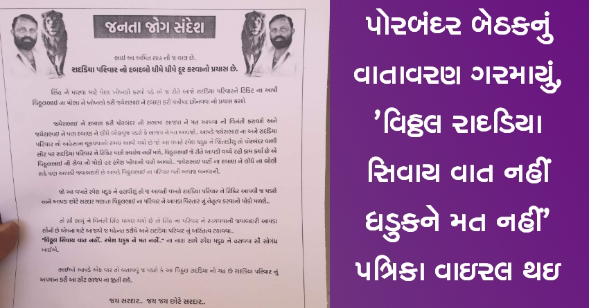 પોરબંદર બેઠકનું વાતાવરણ ગરમાયું, ‘વિઠ્ઠલ રાદડિયા સિવાય વાત નહીં ધડુકને મત નહીં’ પત્રિકા વાઇરલ થઇ