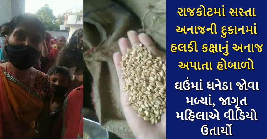રાજકોટના સહકાર મેઈન રોડ પર આવેલી સસ્તા અનાજની દુકાનમાં હલકી કક્ષાનું અનાજ અપાતું હોવાથી જનતા રેડ કરવામાં આવી હતી. જેમાં ઘઉંમાં ધનેડા પડી ગયા હોવાનું જોવા મળ્યું હતું. તેમજ ચણા પણ કાળા પડી ગયેલા જોવા મળ્યાં હતા. હલકી કક્ષાનું અનાજ અપાતું હોવાનો વીડિયો સામાજિક કાર્યકર આશા પટેલે પોતાના મોબાઈલમાં ઉતારી લીધો હતો અને વાઈરલ કર્યો છે. સસ્તા અનાજની દુકાનમાં લોકોએ હોબાળો મચાવ્યો હતો. આશા પટેલે જણાવ્યું હતું કે, પુરવઠા વિભાગ યોગ્ય કાર્યવાહી કરે. લોકોને હલકી કક્ષાનું અનાજ આપી આરોગ્ય સાથે ચેડા કરવામાં આવી રહ્યાં છે.