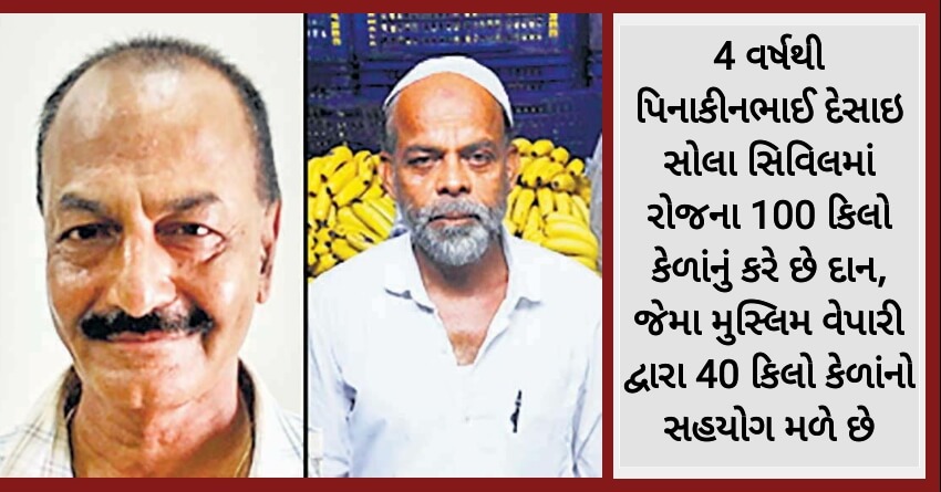 4 વર્ષથી પિનાકીનભાઈ દેસાઇ સોલા સિવિલમાં રોજના 100 કિલો કેળાંનું કરે છે દાન, જેમા મુસ્લિમ વેપારી દ્વારા 40 કિલો કેળાંનો મળે છે સહયોગ