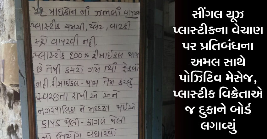 સીંગલ યૂઝ પ્લાસ્ટીકના વેચાણ પર પ્રતિબંધના અમલ સાથે પોઝિટિવ મેસેજ, પ્લાસ્ટીક વિક્રેતાએ જ દુકાને બોર્ડ લગાવ્યું, પ્લાસ્ટીક ચમચી, પ્લેટ, વાટકી, સ્ટ્રો વાપરવી નહીં