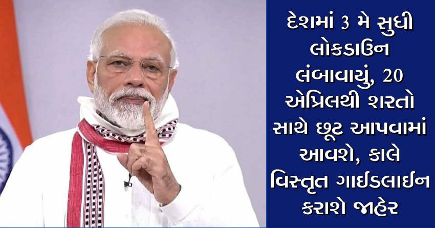 દેશમાં 3 મે સુધી લોકડાઉન લંબાવાયું, 20 એપ્રિલથી શરતો સાથે છૂટ આપવામાં આવશે, કાલે વિસ્તૃત ગાઈડલાઈન કરાશે જાહેર