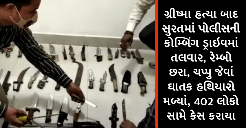 ગ્રીષ્મા હત્યા બાદ સુરતમાં પોલીસની કોમ્બિંગ ડ્રાઇવમાં તલવાર, રેમ્બો છરા, ચપ્પુ જેવાં ઘાતક હથિયારો મળ્યાં, 402 લોકો સામે કેસ કરાયા