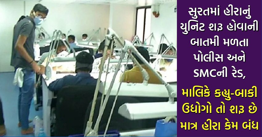 સુરતમાં હીરાનું યુનિટ શરૂ હોવાની બાતમી મળતા પોલીસ અને SMCની રેડ, માલિકે કહ્યુ-બાકી ઉદ્યોગો તો શરૂ છે માત્ર હીરા કેમ બંધ