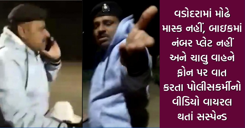 વડોદરામાં મોઢે માસ્ક નહીં, બાઇકમાં નંબર પ્લેટ નહીં અને ચાલુ વાહને ફોન પર વાત કરતા પોલીસકર્મીનો વીડિયો વાયરલ થતાં સસ્પેન્ડ