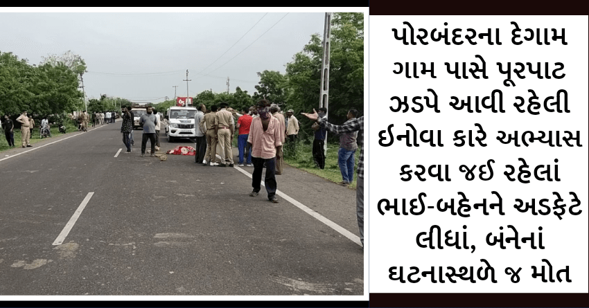 પોરબંદરના દેગામ ગામ પાસે પૂરપાટ ઝડપે આવી રહેલી ઇનોવા કારે અભ્યાસ કરવા જઈ રહેલાં ભાઈ-બહેનને અડફેટે લીધાં, બંનેનાં ઘટનાસ્થળે જ મોત