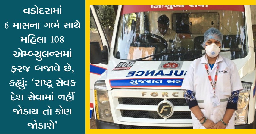 વડોદરામાં 6 માસના ગર્ભ સાથે મહિલા 108 એમ્બ્યુલન્સમાં ફરજ બજાવે છે, કહ્યું: ‘રાષ્ટ્ર સેવક દેશ સેવામાં નહીં જોડાય તો કોણ જોડાશે’