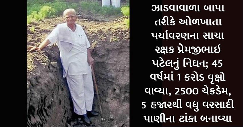ઝાડવાવાળા બાપા તરીકે ઓળખાતા પર્યાવરણના સાચા રક્ષક પ્રેમજીભાઇ પટેલનું નિધન; 45 વર્ષમાં 1 કરોડ વૃક્ષો વાવ્યા, 2500 ચેકડેમ, 5 હજારથી વધુ વરસાદી પાણીના ટાંકા બનાવ્યા