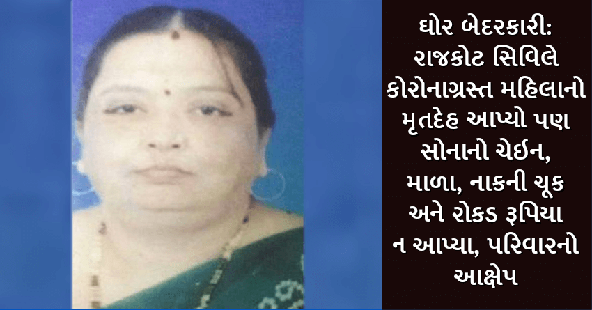 ઘોર બેદરકારી: રાજકોટ સિવિલે કોરોનાગ્રસ્ત મહિલાનો મૃતદેહ આપ્યો પણ સોનાનો ચેઇન, માળા, નાકની ચૂક અને રોકડ રૂપિયા ન આપ્યા, પરિવારનો આક્ષેપ