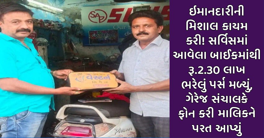 ઇમાનદારીની મિશાલ કાયમ કરી! સર્વિસમાં આવેલા બાઈકમાંથી રૂ.2.30 લાખ ભરેલું પર્સ મળ્યું, ગેરેજ સંચાલકે ફોન કરી માલિકને પરત આપ્યું