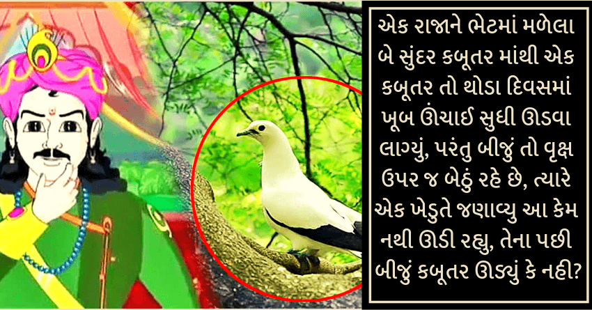 એક રાજાને ભેટમાં મળેલા બે સુંદર કબૂતર માંથી એક કબૂતર તો થોડા દિવસમાં ખૂબ ઊંચાઈ સુધી ઊડવા લાગ્યું, પરંતુ બીજું તો વૃક્ષ ઉપર જ બેઠું રહે છે, ત્યારે એક ખેડુતે જણાવ્યુ આ કેમ નથી ઊડી રહ્યુ, તેના પછી બીજું કબૂતર ઊડ્યું કે નહી?