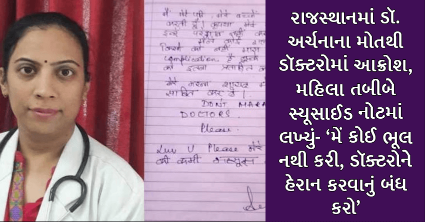 રાજસ્થાનમાં ડૉ. અર્ચનાના મોતથી ડૉક્ટરોમાં આક્રોશ, મહિલા તબીબે સ્યૂસાઈડ નોટમાં લખ્યું- ‘મેં કોઈ ભૂલ નથી કરી, ડૉક્ટરોને હેરાન કરવાનું બંધ કરો’