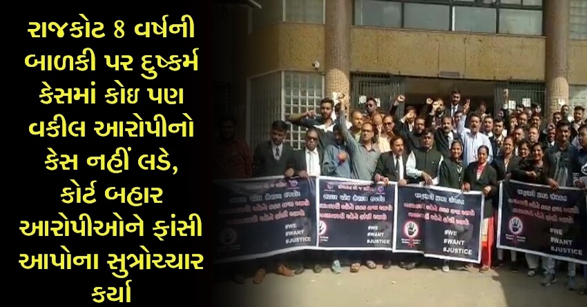 રાજકોટ 8 વર્ષની બાળકી પર દુષ્કર્મ કેસમાં કોઇ પણ વકીલ આરોપીનો કેસ નહીં લડે, કોર્ટ બહાર આરોપીઓને ફાંસી આપોના સુત્રોચ્ચાર કર્યા