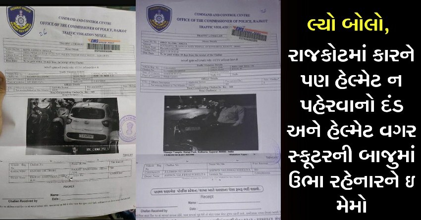 લ્યો બોલો, રાજકોટમાં કારને પણ હેલ્મેટ ન પહેરવાનો દંડ અને હેલ્મેટ વગર સ્કૂટરની બાજુમાં ઉભા રહેનારને ઇ મેમો