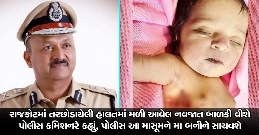 રાજકોટમાં બુધવારના રોજ તરછોડાયેલી હાલતમાં નવજાત બાળકી મળી આવી હતી. આ બાળકીના શરીર પર 20 જેટલા તીક્ષ્ણ હથિયાના ઘા જોવા મળ્યા હતા. હાલ બાળકીની હોસ્પિટલમાં સારવાર ચાલી રહી છે ત્યારે રાજકોટ પોલીસ કમિશનર દ્વારા કહેવામાં આવ્યું છે કે, ભવિષ્યમાં આ બાળકીને કોઈ સાચવવા તૈયાર નહીં થાય તો પોલીસ આ માસુમની મા બનીને સાચવશે.