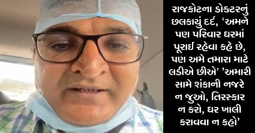 રાજકોટના ડોક્ટરનું છલકાયું દર્દ, ‘અમને પણ પરિવાર ઘરમાં પૂરાઈ રહેવા કહે છે, પણ અમે તમારા માટે લડીએ છીએ’ ‘અમારી સામે શંકાની નજરે ન જુઓ, તિરસ્કાર ન કરો, ઘર ખાલી કરાવવા ન કહો’