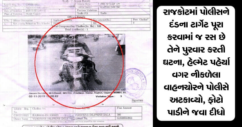 રાજકોટમાં પોલીસને દંડના ટાર્ગેટ પૂરા કરવામાં જ રસ છે તેને પુરવાર કરતી ઘટના, હેલ્મેટ પહેર્યા વગર નીકળેલા વાહનચોરને પોલીસે અટકાવ્યો, ફોટો પાડીને જવા દીધો