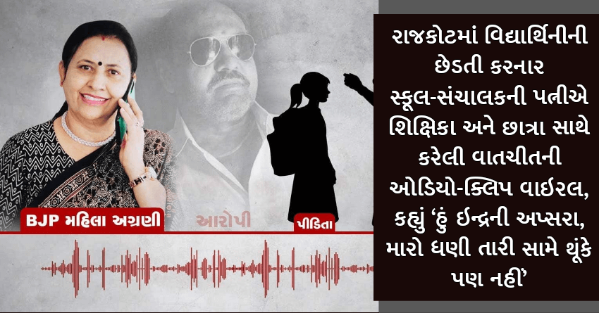 રાજકોટમાં વિદ્યાર્થિનીની છેડતી કરનાર સ્કૂલ-સંચાલક પત્નીની શિક્ષિકા અને છાત્રા સાથે કરેલી વાતચીતની ઓડિયો-ક્લિપ વાઇરલ, કહ્યું ‘હું ઇન્દ્રની અપ્સરા, મારો ધણી તારી સામે થૂંકે પણ નહીં’
