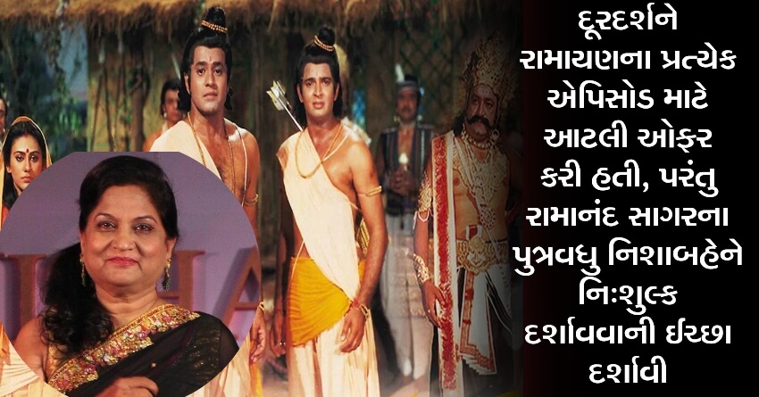 દૂરદર્શને રામાયણના પ્રત્યેક એપિસોડ માટે આટલી ઓફર કરી હતી, પરંતુ રામાનંદ સાગરના પુત્રવધુ નિશાબહેને નિ:શુલ્ક દર્શાવવાની ઈચ્છા દર્શાવી